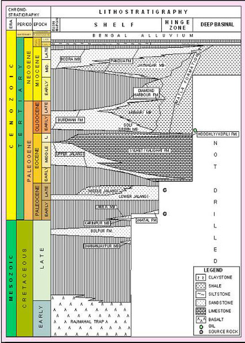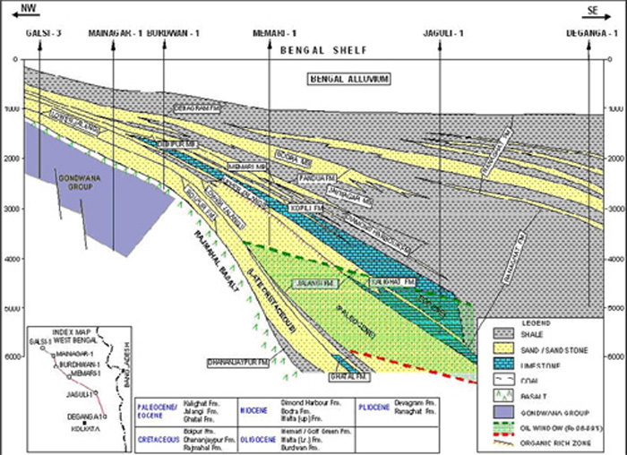 | Reservoir Facies | Reservoir facies are available in abundance within the Gondwana and Paleocene sequences are of arenaceous character. Sandstone reservoirs occur in abundance within the Bolpur, Lower Jalangi and Upper Jalangi formations and higher up within the Burdwan Formation of Oligocene age. A Sand within the Burdwan Formation is found oil bearing in well Ichapur–1. In the Miocene sequence, sandstone reservoirs are present in abundance within the Bodra and Pandua formations. |