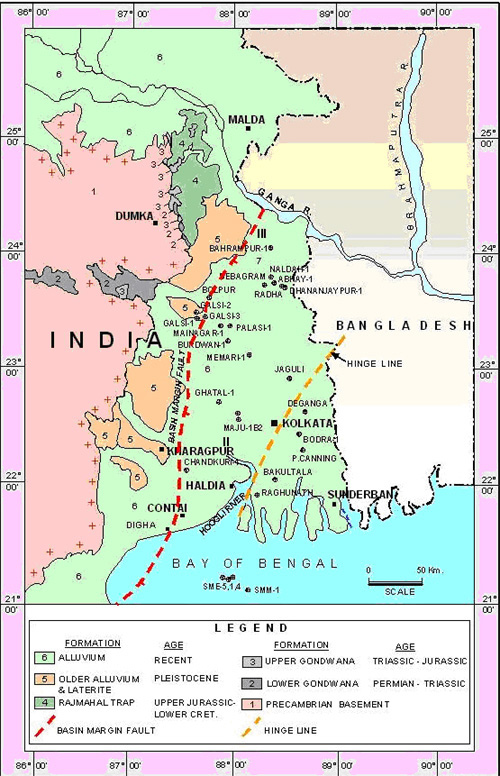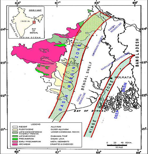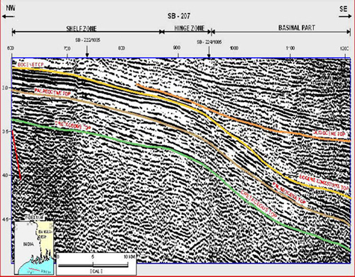 Bengal ‘Hinge Zone’ is a narrow elongated zone separates the thick Post-Eocene sediments in the east from the shelf zone of the west. This feature runs in NNE-SSW direction from east of Kolkata. It is seen to be prominent on seismic records as an abrupt change of slope and a flexure at ‘D’ reflector corresponding to top of Eocene limestone. Eocene limestone further east of hinge zone possibly grades to shales and other deep basin sediments. This zone has given rise to a belt of possible flexures and faulting during Oligocene and Miocene. Truncations and wedgeouts against the hinge zone are characterstic. Golf Green and Ichapur wells are observed to fall in this trend. The hinge zone is associated with gravity high and magnetic low. However, seismic data indicates only a change in basement slope along this zone.