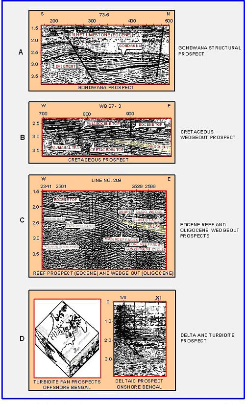| Mio – Pliocene Prospects | Seismic facies analysis and basin modeling (done by ongc) indicate development of two types of prospects in the Mio-Pliocene section (a) deltaic, and (b) prospect associated with turbidite facies along the shelf–slope area south of Sunderbans |