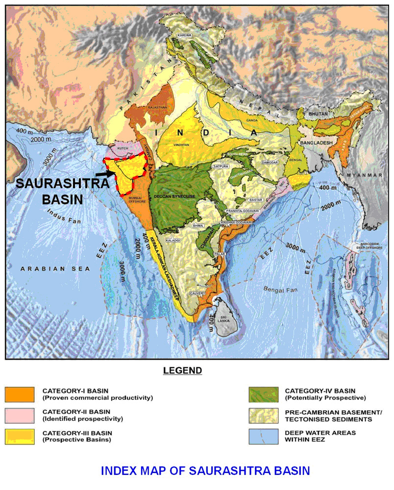 Late Cretaceous – Early Paleocene Deccan Volcanics cover most of the Saurashtra Peninsula and the Tertiary sediments are exposed only on the periphery of the Peninsula. The tertiary sedimentary sequences consisting dominantly of Carbonates and fine grained clastics overlying the Deccan Trap Volcanics in the shelfal region have been explored for Hydrocarbon prospectivity.