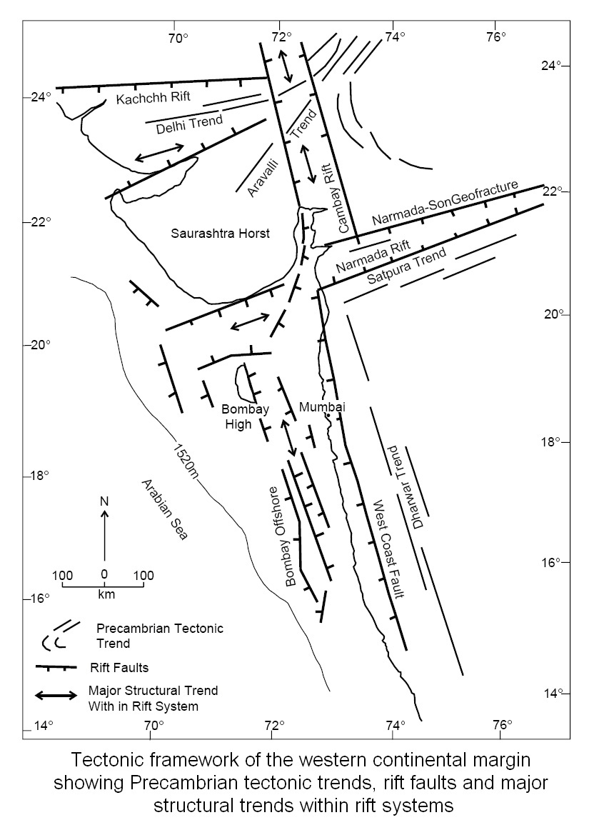 Western continental margin basins of India is related to the breakup of eastern Gondwanaland from the western Gondwanaland in the Late Triassic / Early Jurassic and subsequent spreading history of the eastern Indian ocean. Western margin evolved through early rift and post rift phases of divergent margin development. A series of regional and local horsts and grabens results in response to rifting along the dominant basement tectonic trends (NNW-SSE, NE-SW & ENE-WSW).