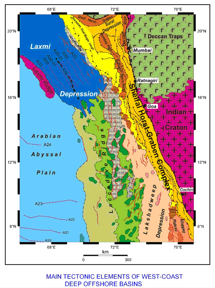 ENE – WSW Satpura trend influences the structural grain of Saurashtra offshore basin. The environmental framework of the Saurashtra Basin and basins south of it got differentiated into shelf, slope and basin floor. The shelfal horst-graben complex formed the site for development of shelf depositional systems, whereas the Laxmi Depression, Laccadive Ridge, Laccadive depression lay in the slope and basinal part.
